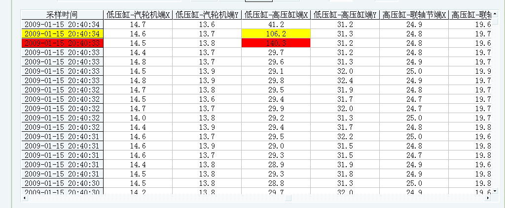 判断:初步怀疑是油液内含有杂质或气泡。检查低压缸油液分离器,未发现异常,但是一直密切关注机组运行状态的变化。机组运行几天后,该现象自动消失,机组和监测系统运行归为正常。由于机组自带监测仪表无法记录下这种短时瞬间的振动,因此再一次说明本在线监测系统具有记录瞬间突变功能,真正做到24小时、连续无遗漏地对机组进行监测,并及时将故障情况记录下来。