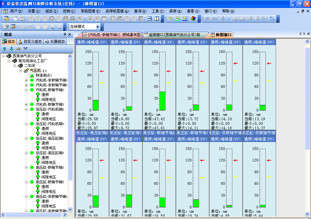 气压机组和烟机组预埋监控系统,我公司监测诊断系统从二次仪表引出信号,接入DH5970(防爆型)和DH5973(标准机柜安装)在线监测诊断系统。监测诊断系统提供各种图谱用于故障诊断和启停机监测。