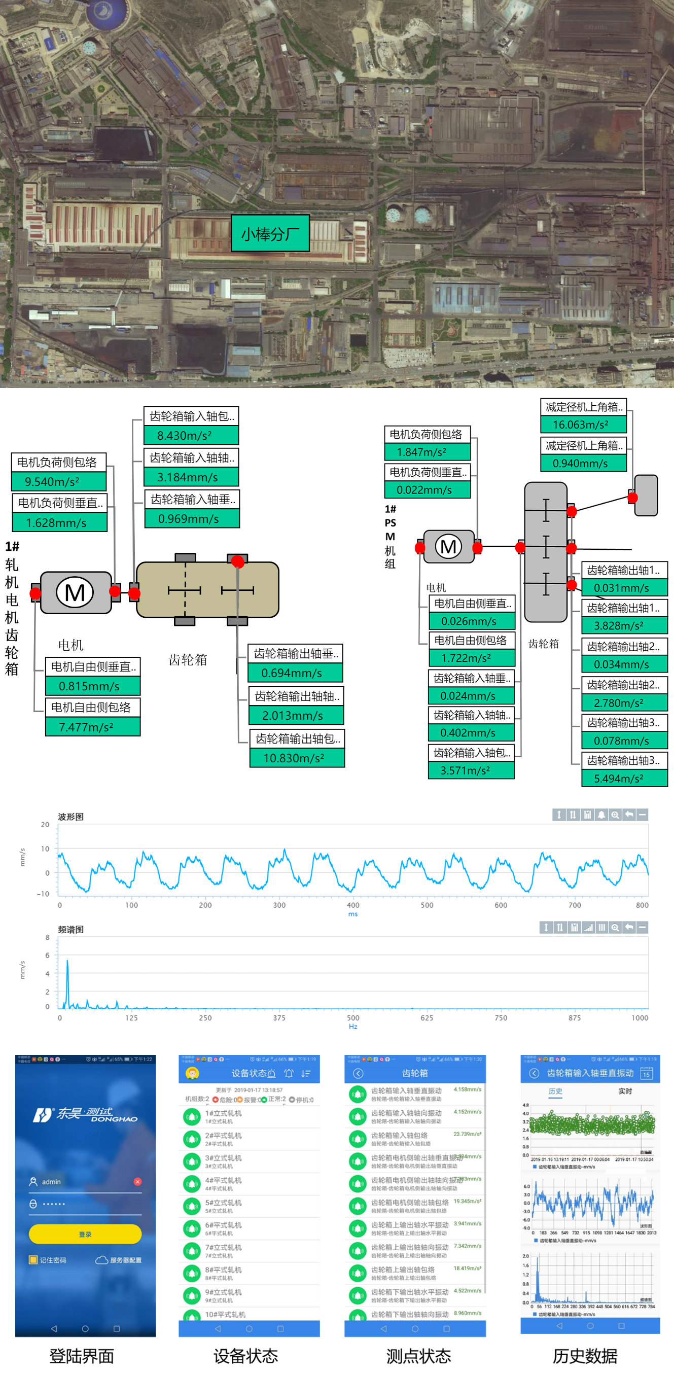 监测对象:21台轧机(平式和立式)+1台减定径轧机监测参数:振动+包络测点位置:电机自由侧垂直、电机负荷侧垂直、 齿轮箱输入轴垂直/轴向、齿轮箱输出轴垂直/轴向、 齿轮箱上输出轴水平/轴向、齿轮箱下输出轴水平/轴向。硬件配置采集系统:11台DH5973+CMA3.0+DHAPP传感器:188个1A946E压电式传感器典型现场: