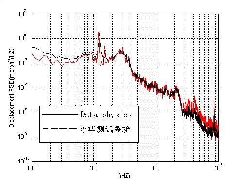 这一步采用的校核方法是:把采集获得的原始信号(速度信号)用DATA Physics软件与江苏东华测试技术有限公司的振动测试软件分别进行分析,在同一张图中画出各自分析的位移功率谱密度曲线,通过比较这两条曲线的重合度来判定分析处理的软件是否可靠。