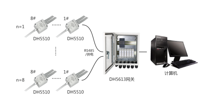 3.5 采集器DH5510与应变网关控制器DH5613之间通过RS485总线通讯,支持串联或星型连接,***远端采集器距离可达100米(距离越远,采集器数量越少);